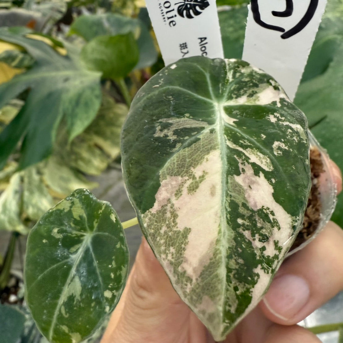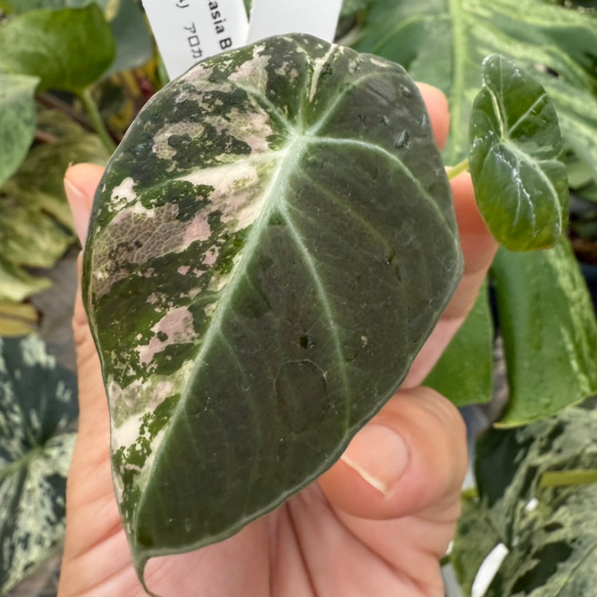アロカシアブラックベルベットピンク斑入りは、ベルベットのような質感の葉に、美しいピンクや白い斑模様が入る魅力的なアロカシアです。