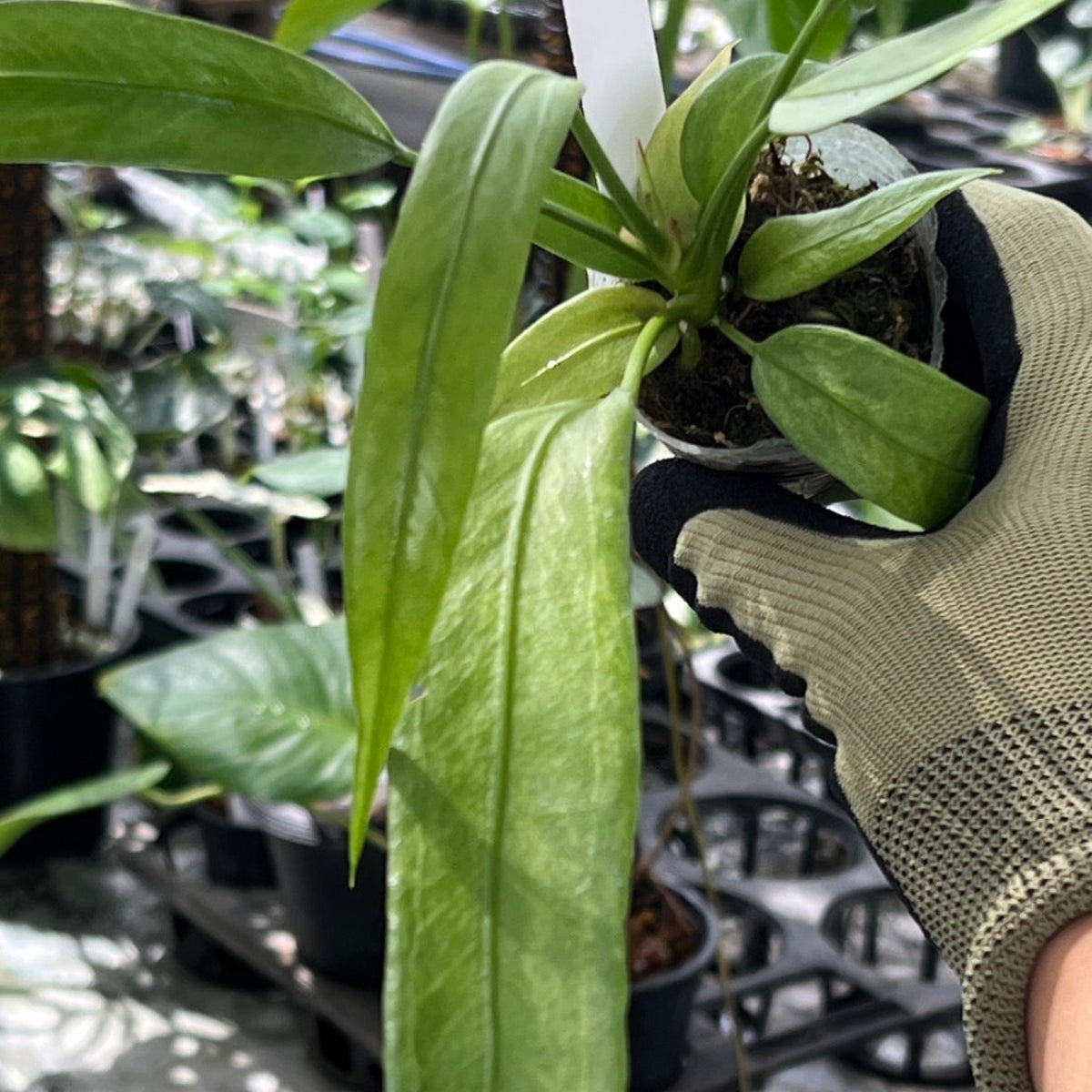 アンスリウム ビッタリフォリウム斑入りは、サトイモ科アンスリウム属の原種で、細長く垂れ下がる葉が特徴的な観葉植物です。ネクタイのように見えることから「ネクタイ」や「ストラップリーフ」とも呼ばれ、ハンギングバスケットや高さのある鉢によく合います。