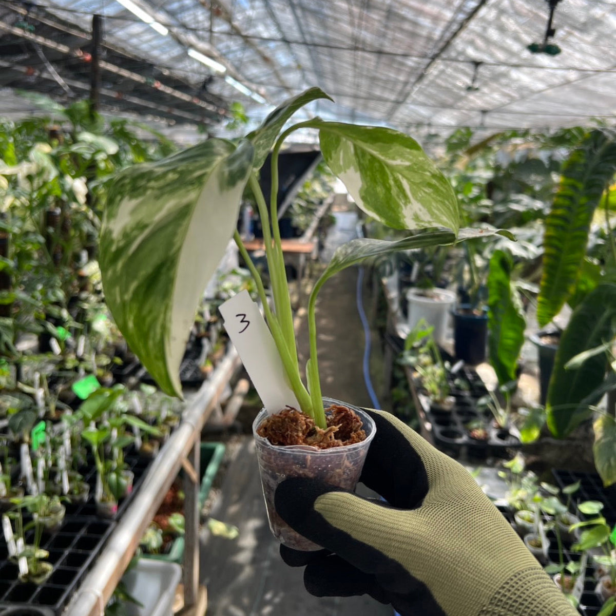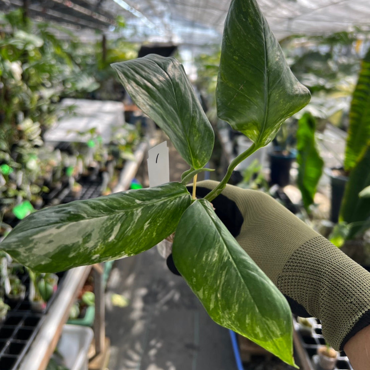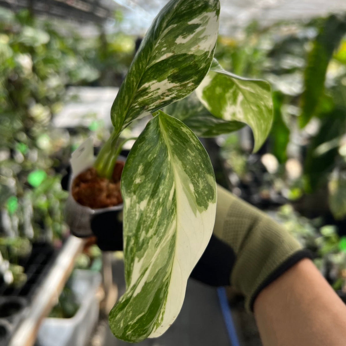 モンステラ・レクレリアナ 斑入り (Monstera lechleriana 'Variegata') は、モンステラの中でも比較的流通量が少なく、その独特な葉の形状と美しい斑が人気の希少品種です