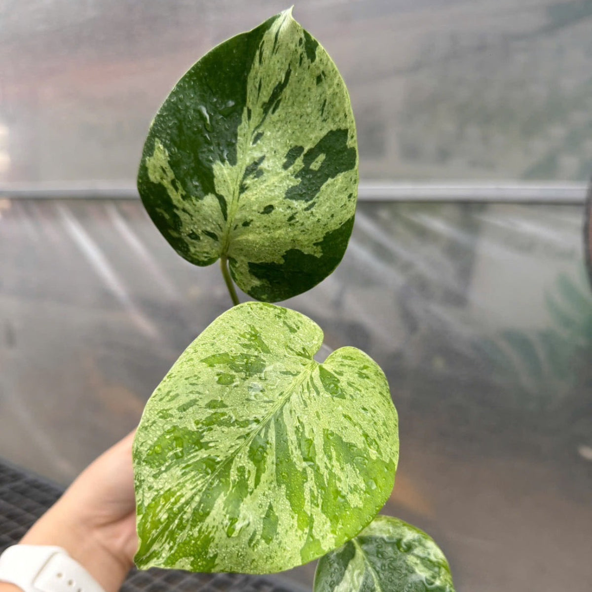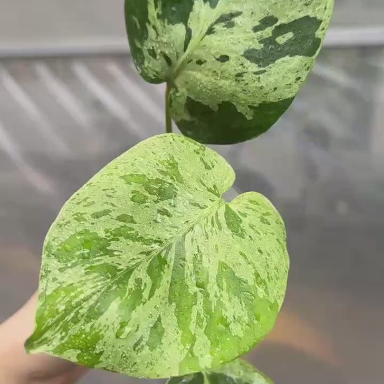 ベトシオーサの最大の魅力は、深い緑色と銀色が織りなす、まるで芸術作品のような美しい模様です。さらに、温度環境によって葉の色合いが変化するという興味深い特徴も持ち合わせています。30℃付近では、緑色の葉に緑と白を混ぜたような斑が入り、35℃程度の環境では、葉が明るくなり黄緑色の斑が現れると言われています。